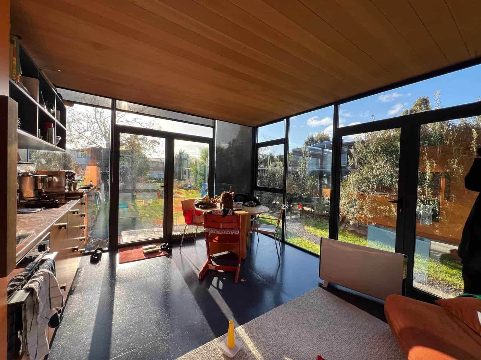 The 6 × 4 m Flat Pack Cabin with Glass Wrap Wall is constructed using a robust steel framework and high-performance insulated panels, delivering durability, thermal efficiency, and long-term structural integrity.
