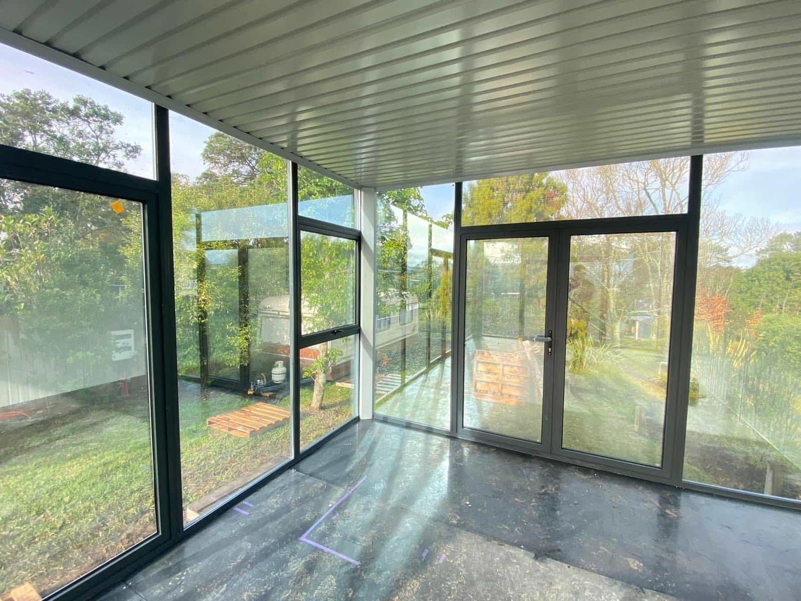 Insulated panels featuring 50 mm EPS (Expanded Polystyrene) cores, offering effective thermal and acoustic insulation for year-round comfort. Front wall is made from double glazed insulated glass.